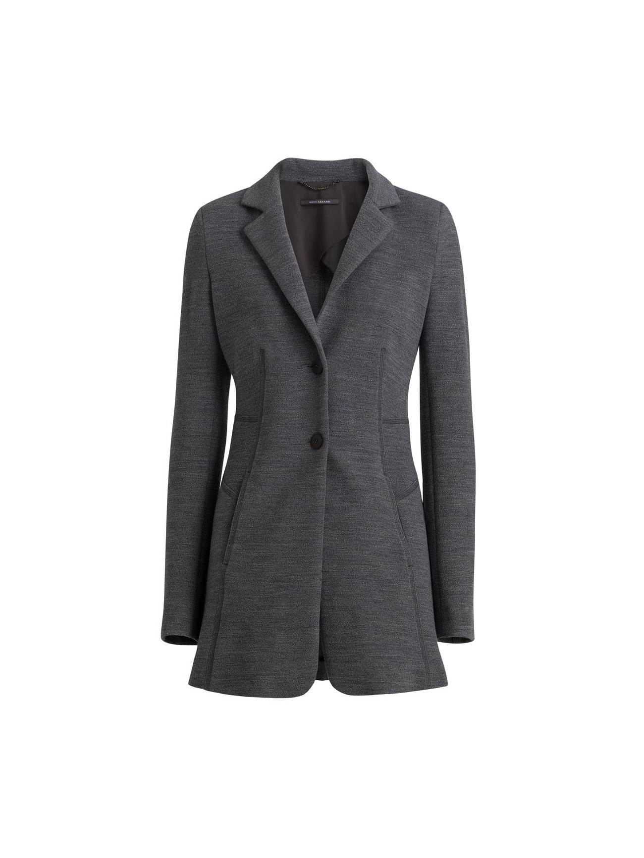 Femininer Dandy-Charme verleiht der superedle Jersey-Gehrock mit tailliertem Schnitt, Leistentaschen und abgerundetem Kanten. Strukturierte Schurwolle in Melangeoptik machen ihn zum Eyecatcher.