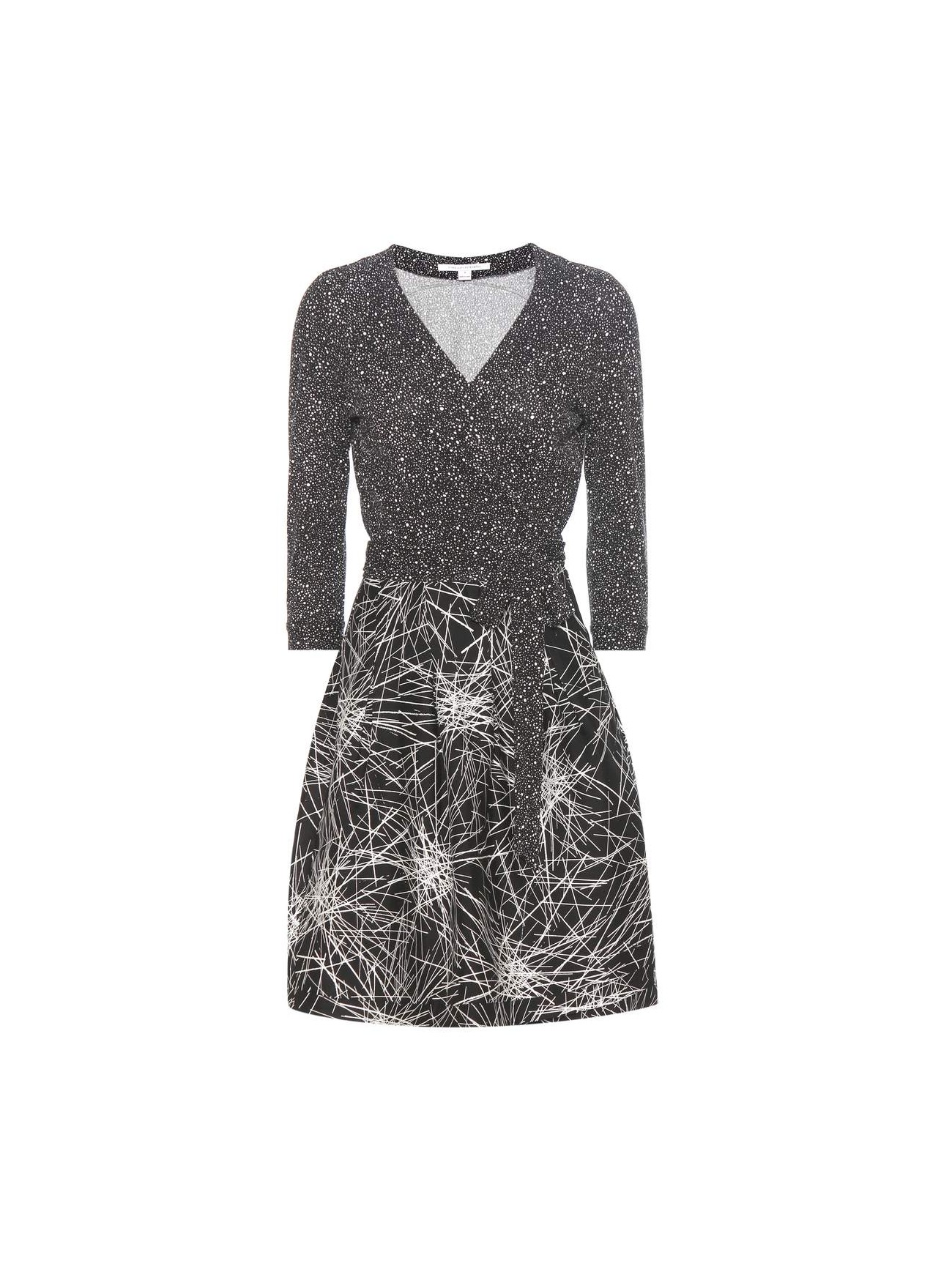 Diane von Furstenberg kombiniert bei dem Wickelkleid Jewel aus einem Woll-Seidengemisch verschiedene Prints miteinander. So schmückt ein grafisches Allover-Muster den leicht in Falten gelegten Rockteil, während das Oberteil mit Polkadots bedruckt ist und von einem passenden Bindegürtel in der Taille akzentuiert wird. Kombinieren sie das Modell für ein entspanntes Tagesoutfit mit Loafers und am Abend zu High Heels.