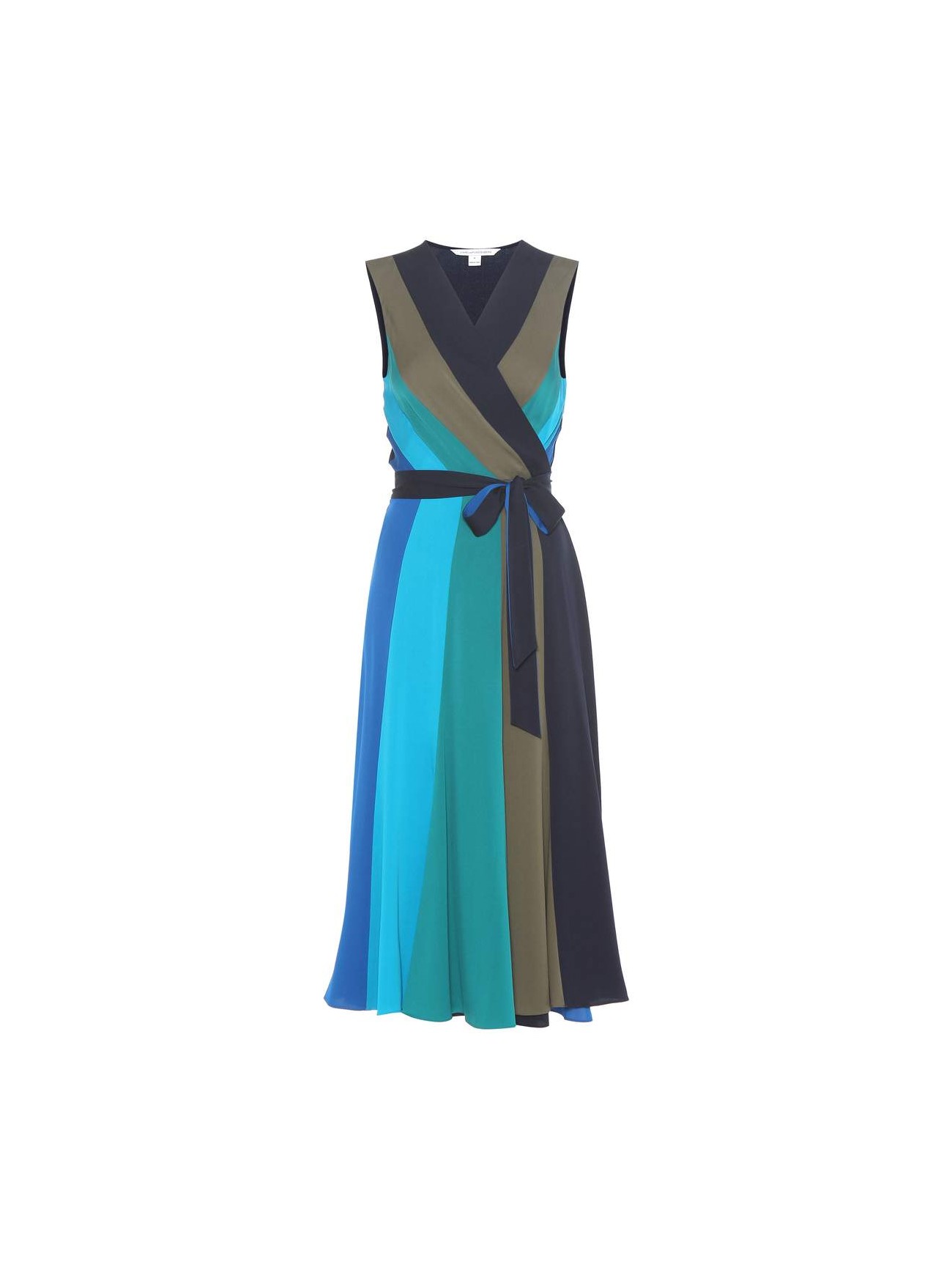 Das Kleid ist aus angenehm leichter Stretch-Seide in Blau- und Grüntönen sowie Schwarz gefertigt. Wie lieben die ärmellose Silhouette und den ausgestellten Rock.