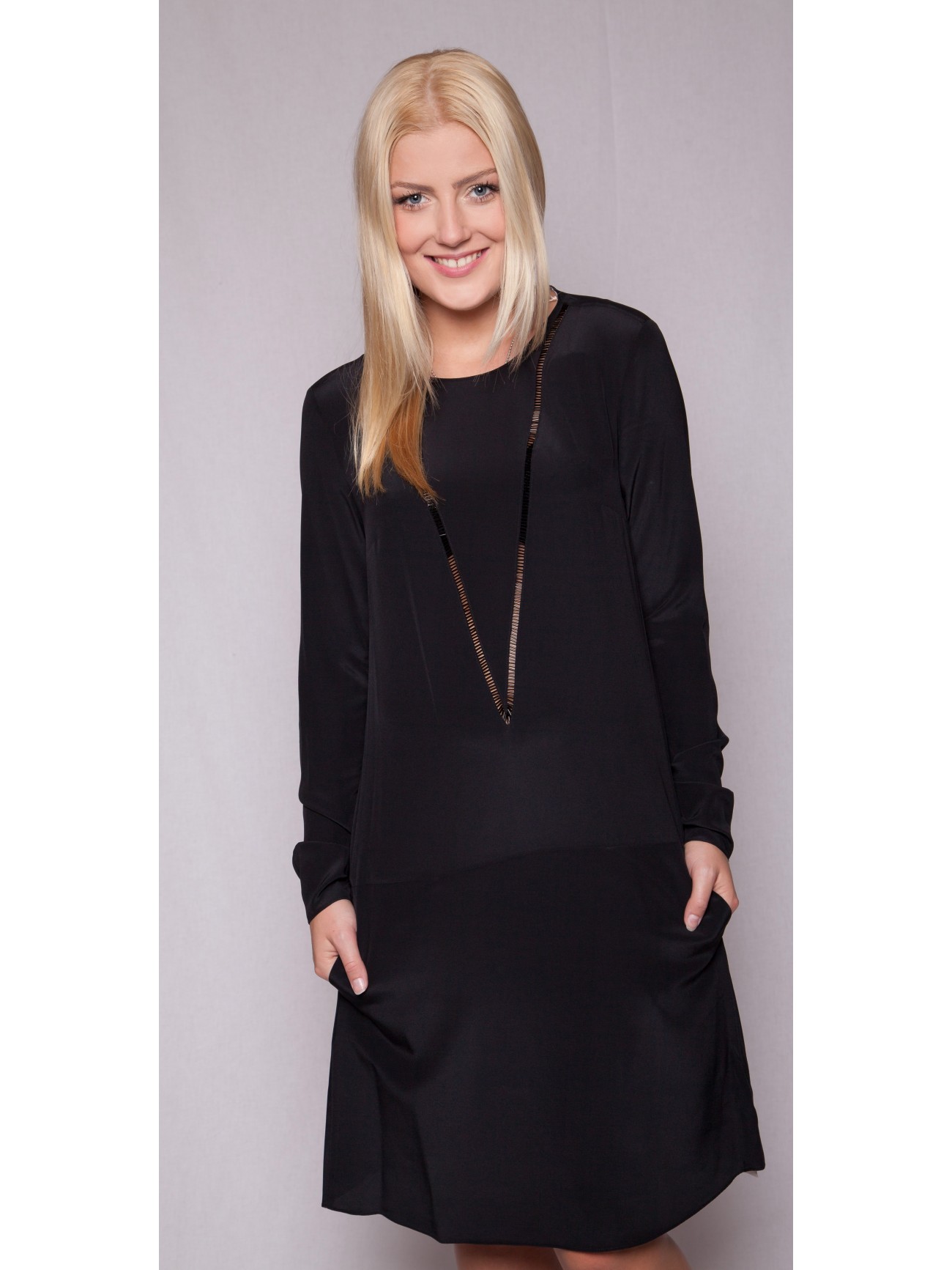 Schlichtes Seidenkleid von Dorothee Schumacher mit Schmucksteinen in V-Form.