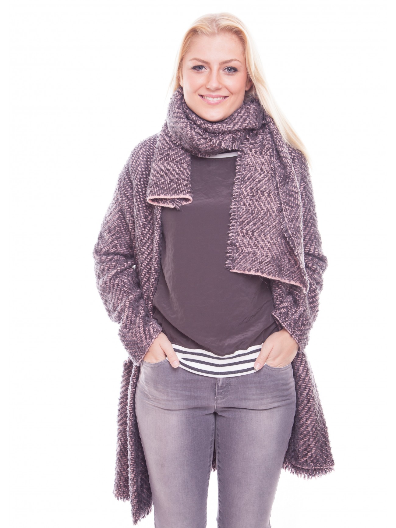 Langer Mantel von Marc Cain aus einer Wollmischung mit Schurwolle und Alpaka. Der Strickmantel hat ein Fischgrat-Muster mit leichtem Degradee-Effekt. Zwei aufgesetzte Taschen und Fransen am Saum ergänzen das Design. Der Strickmantel wird offen getragen.