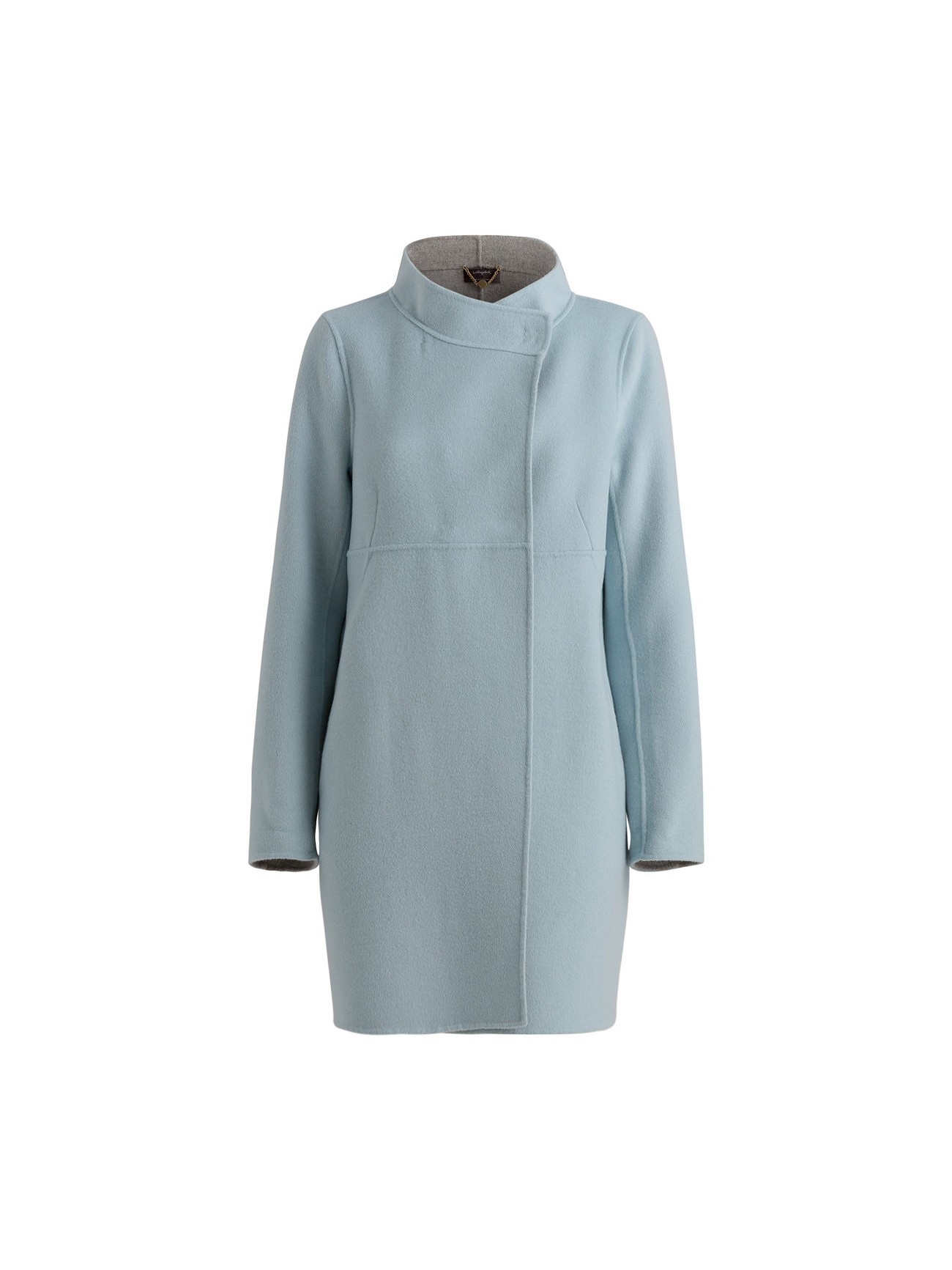 Schurwoll Double und eine grafische Schnittführung verleihen dem klassischen Mantel ein modernes Update. Dank edlen Druckknöpfen wird der Mantel asymmetrisch geschlossen und zum Eyecatcher.