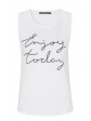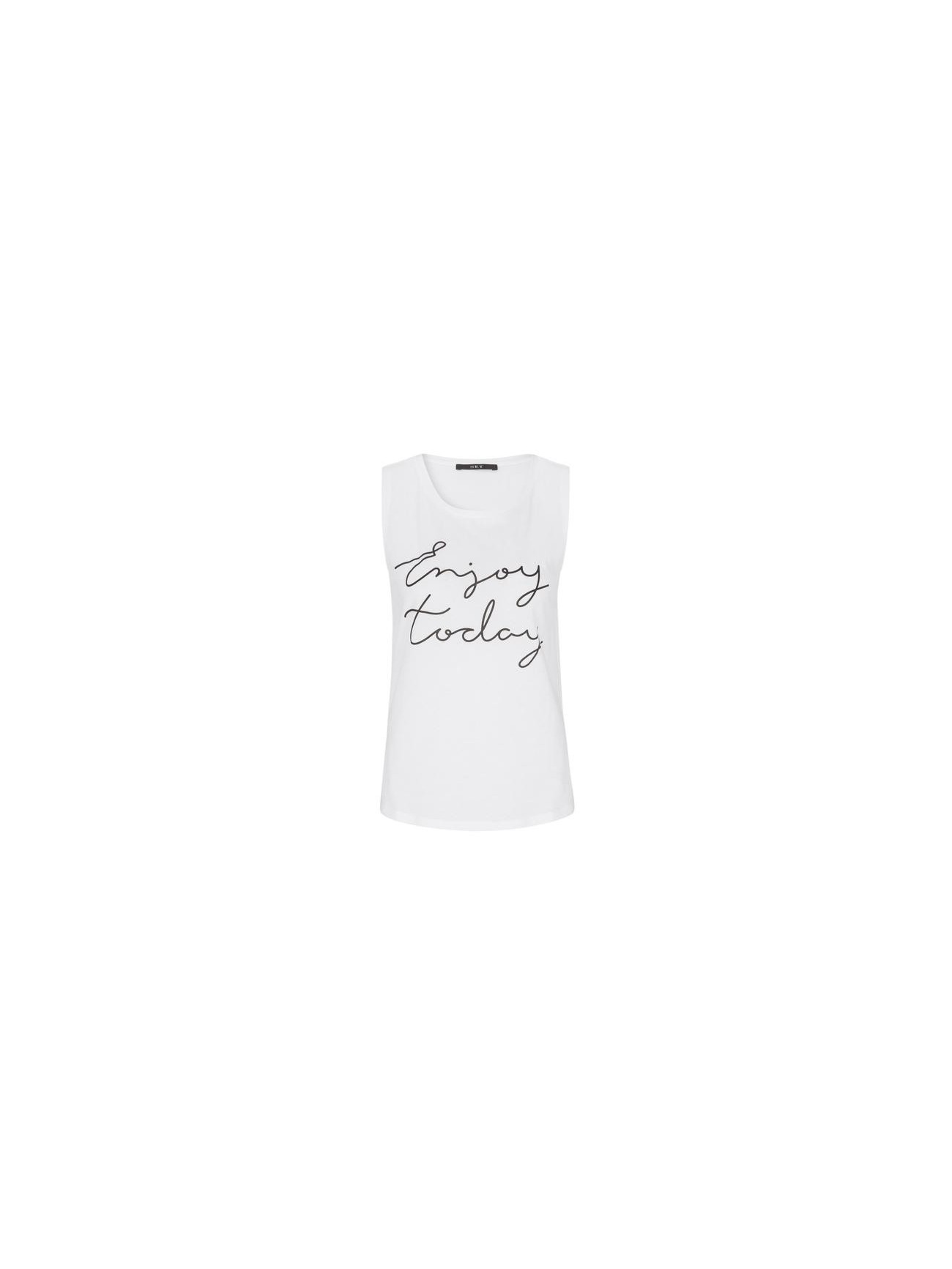 Gerade geschnittenes weißes Shirt ohne Ärmel mit platziertem Druck „enjoy today“ auf der Vorderseite. Der Saum leicht abgerundet, das Rückteil 4 cm länger geschnitten.