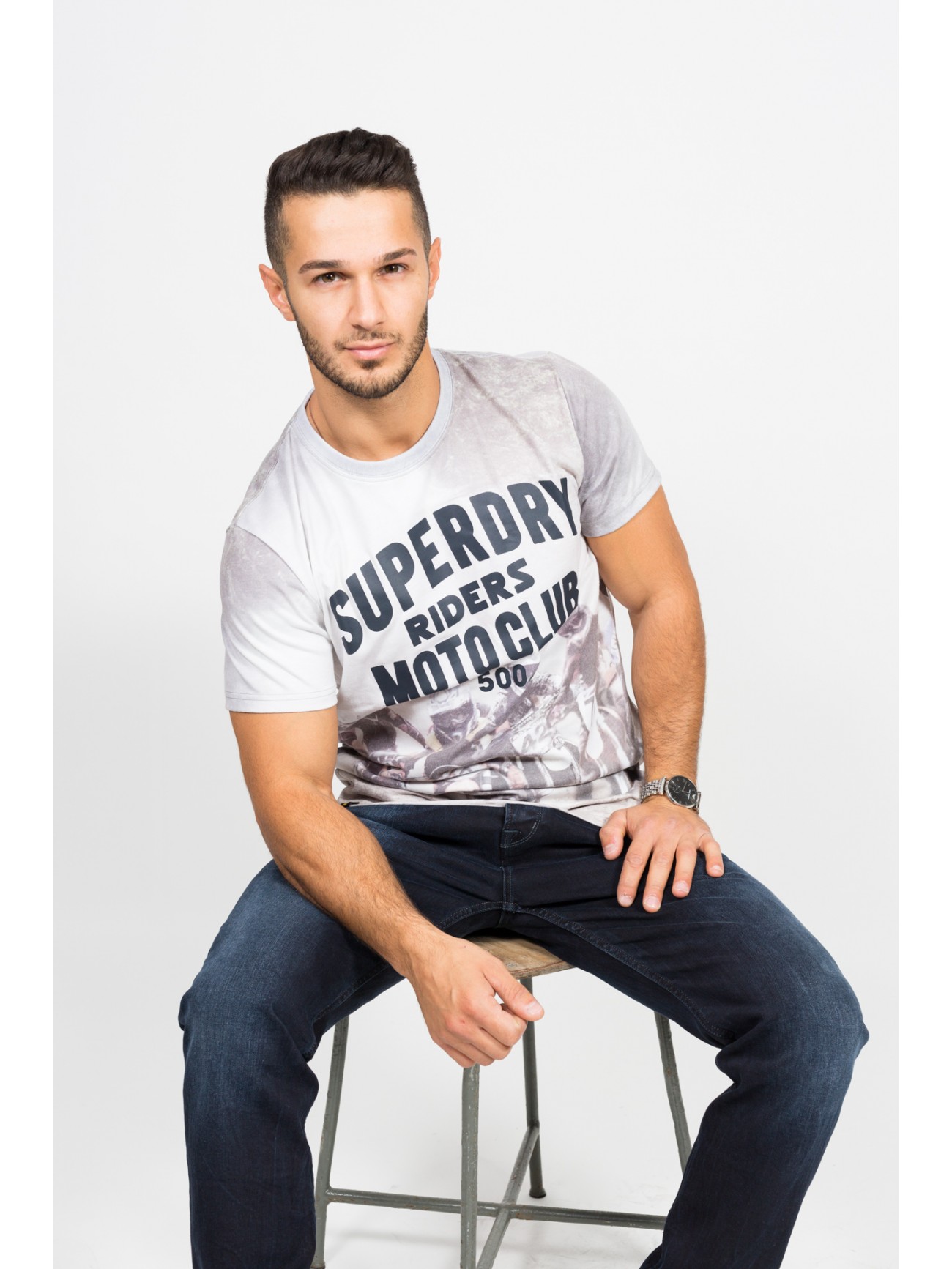 Stylishes Herren T-Shirt von Superdry mit Motorrad Rennen Motiv in hellgrau.