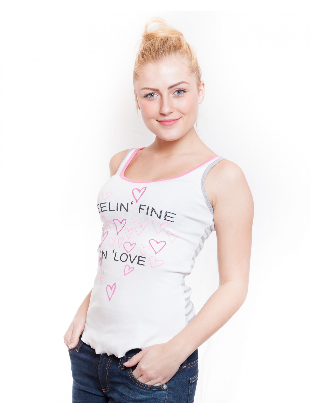 Dieses Top besticht durch ein Ringelmuster auf der Rückseite und einem Statement-Print und Herzen auf der Vorderseite welchses teilweise geflockt und geschmückt ist. Die Ärmelausschnitte und Ausschnitt sind farbig abgesetzt. Der Saum des Tank Tops ist gerundet und leicht gewellt. Aufwändig abgesteppte Seitennähte machen den Look perfekt.